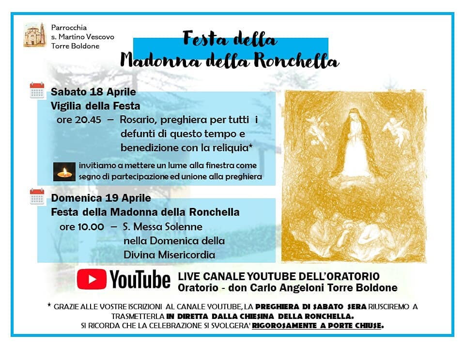 Mancherà il trovarsi e lo stare insieme, ma non mancherà il ricordo della festa, la nostra preghiera e il nostro affidamento alla Madonna della Ronchella, soprattutto in questo tempo che viviamo. 🙏