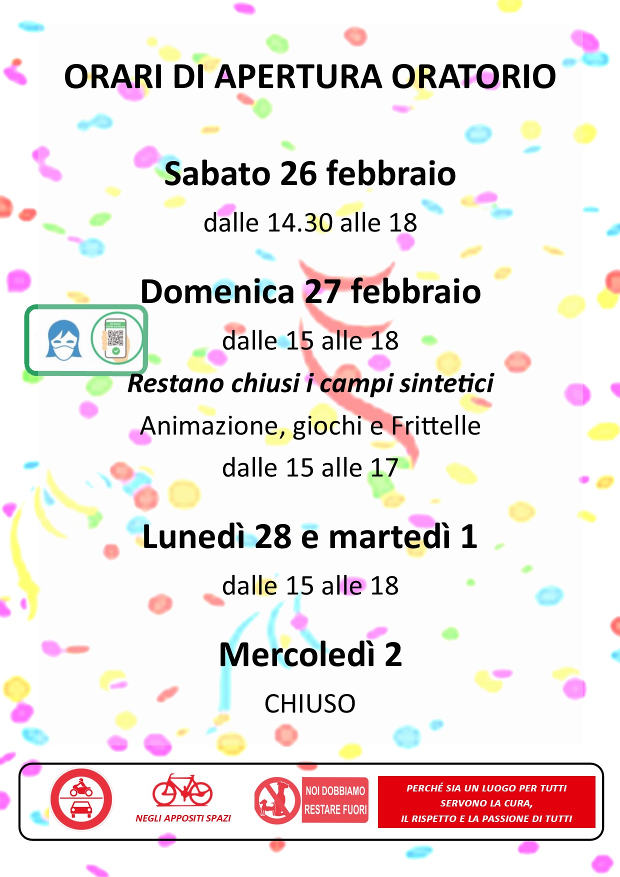 Orari apertura oratorio 26 febbraio – 2 marzo 2022