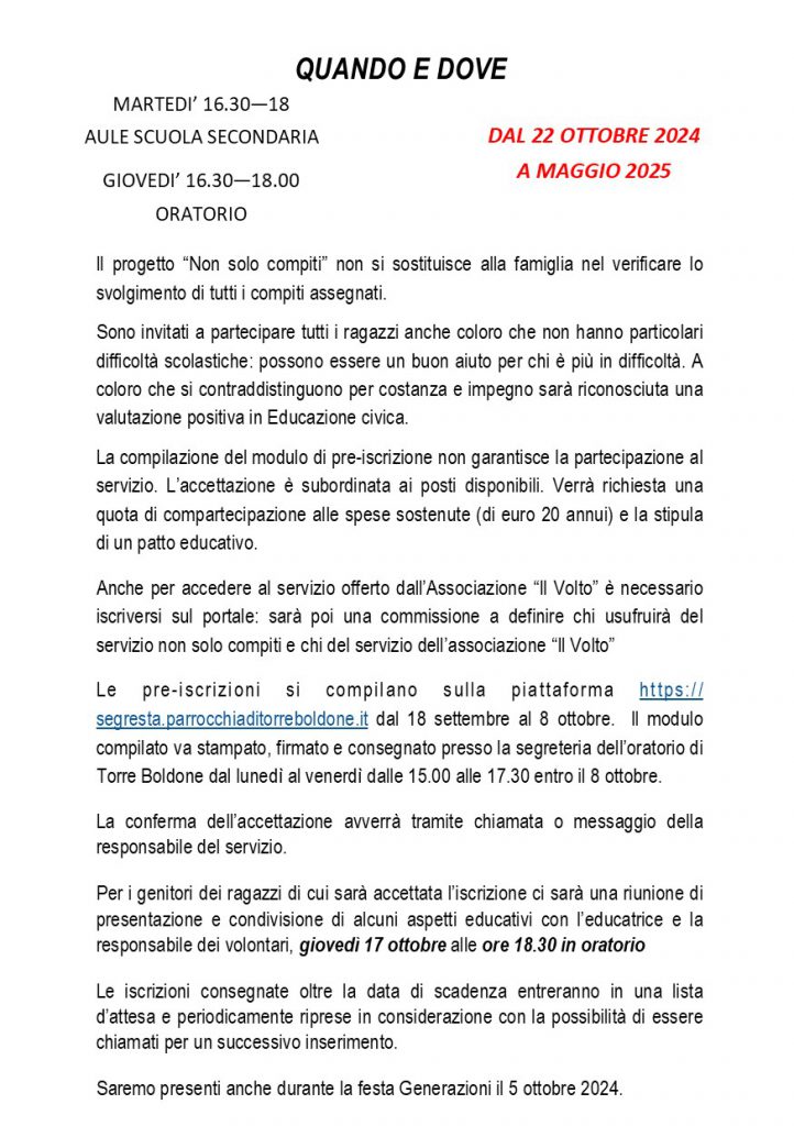 Le pre-iscrizioni si compilano sulla piattaforma https://segresta.parrocchiaditorreboldone.it dal 18 settembre al 8 ottobre. Il modulo compilato va stampato, firmato e consegnato presso la segreteria dell’oratorio di Torre Boldone dal lunedì al venerdì dalle 15.00 alle 17.30 entro il 8 ottobre.