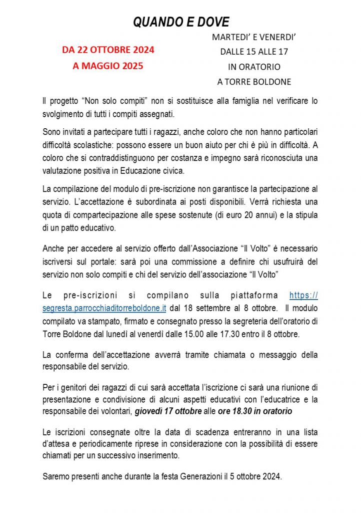 Le pre-iscrizioni si compilano sulla piattaforma https://segresta.parrocchiaditorreboldone.it dal 18 settembre al 8 ottobre. Il modulo compilato va stampato, firmato e consegnato presso la segreteria dell’oratorio di Torre Boldone dal lunedì al venerdì dalle 15.00 alle 17.30 entro il 8 ottobre.