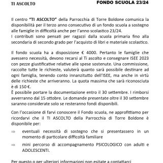 Sono aperte le iscrizioni all’anno catechistico 23-24 Compila l’scrizione sul portale https://segresta.parrocchiaditorreboldone.it/ Firma e consegna l’iscrizione in oratorio entro il 30 settembre La parrocchia propone l’inizio del cammino di catechesi quando il bambino frequenta la...
