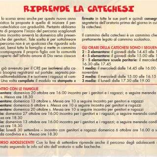 E’ possibile iscrivere i ragazzi dalla 2 elementare alla 2 media al percorso catechistico e i ragazzi dalla 3 media alla 4 superiore al percorso adolescenti. Come sempre serve compilare il modulo sul portale https://segresta.parrocchiaditorreboldone.it ...