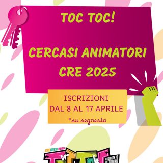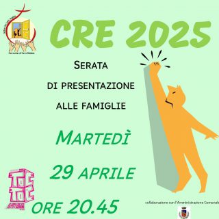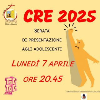 Vuoi fare l’animatore del CRE 2025??? Lunedì sera alle 20.45 Presentazione del CRE a tutti gli adolescenti Iscrizioni dal 10 al 17 aprile